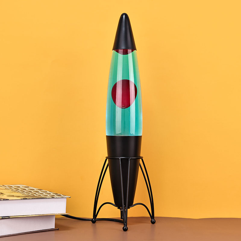 Đèn dung nham màu xanh với đèn sáp hình ổ cắm có nước tinh khiết bên trong kính trong suốt và sáp màu xanh lá cây bên trong. Sau khi được làm nóng, sáp trôi nổi không đều trong nước, được đánh giá cao.