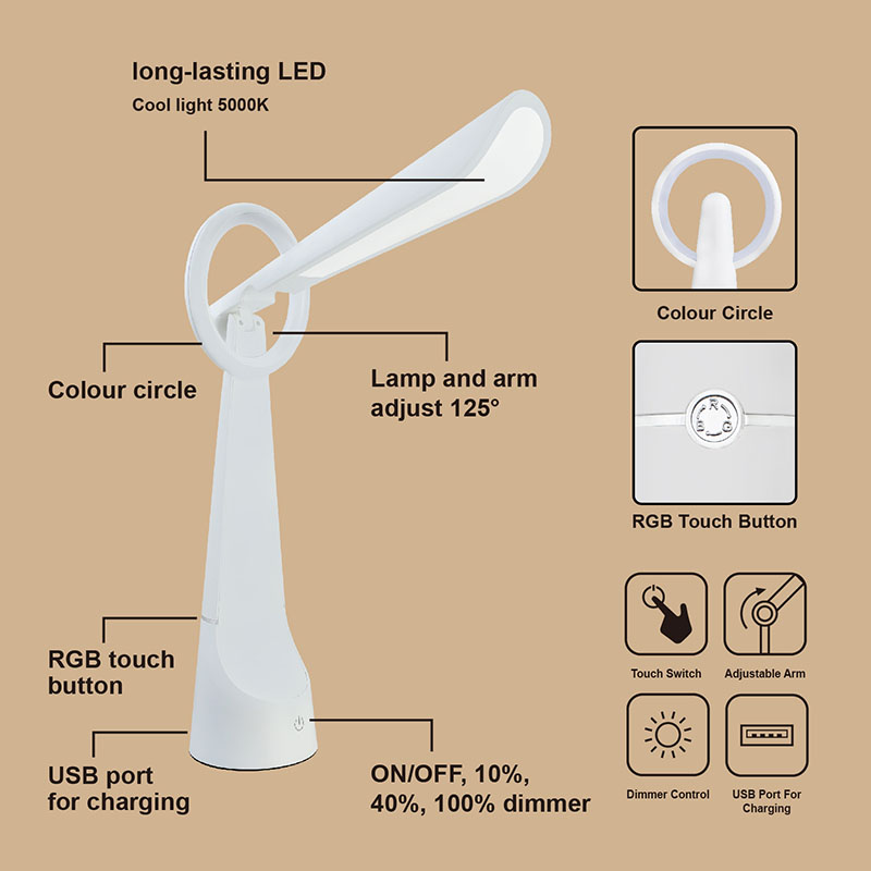 Đèn bàn trang trí led rgb có thể điều chỉnh độ sáng 3 phía sau trên thân sản phẩm. Đầu đèn led có thể mở tối đa 125°.