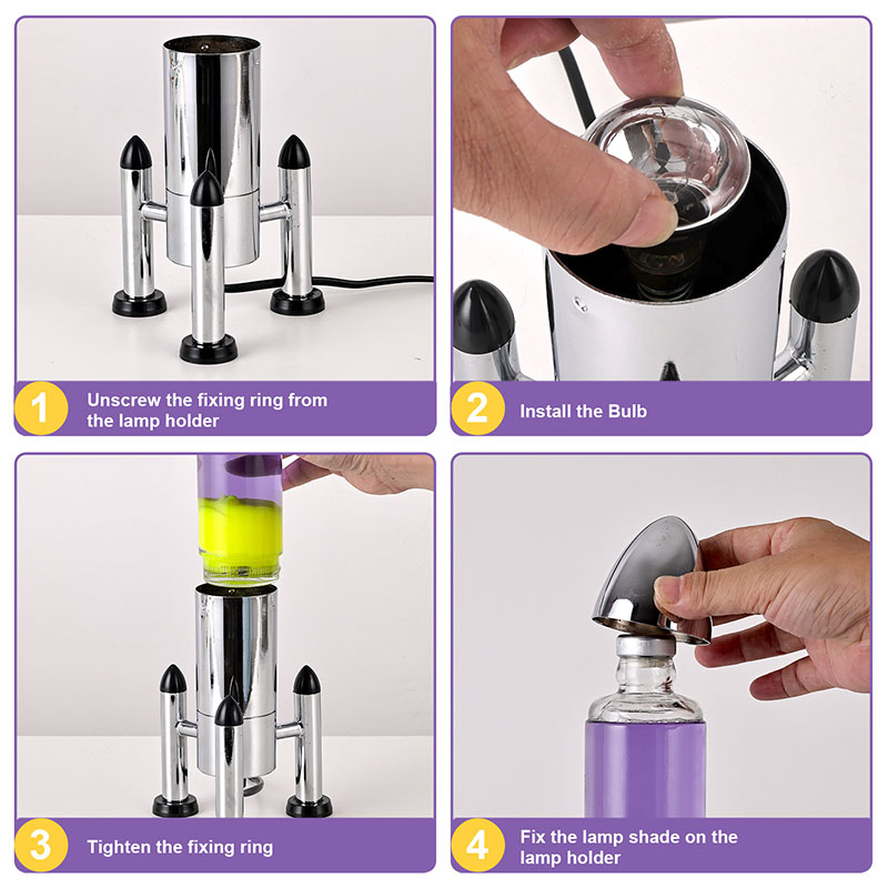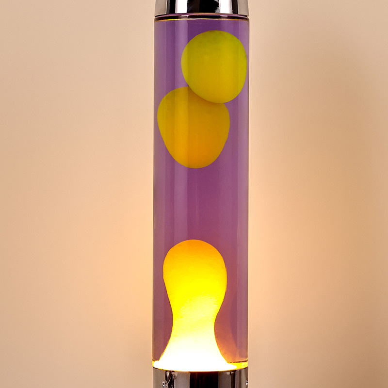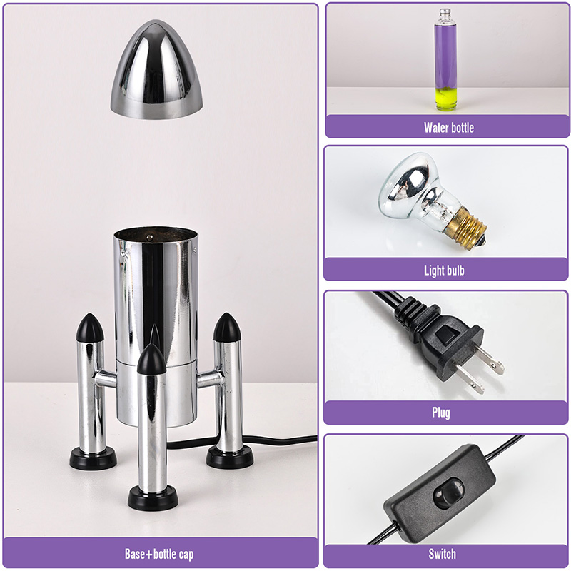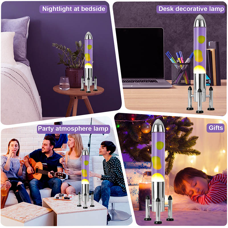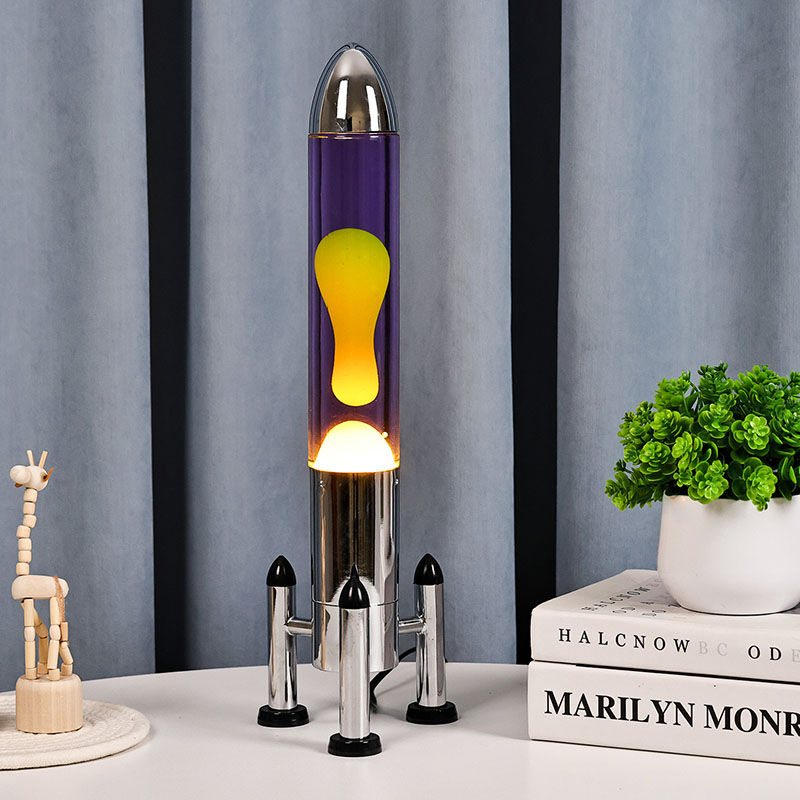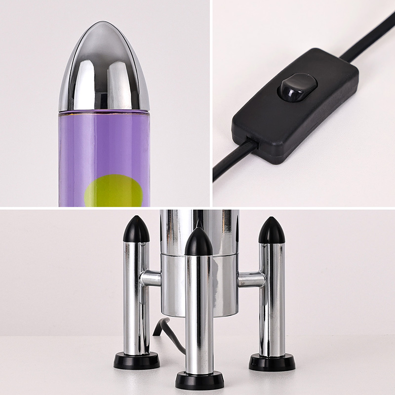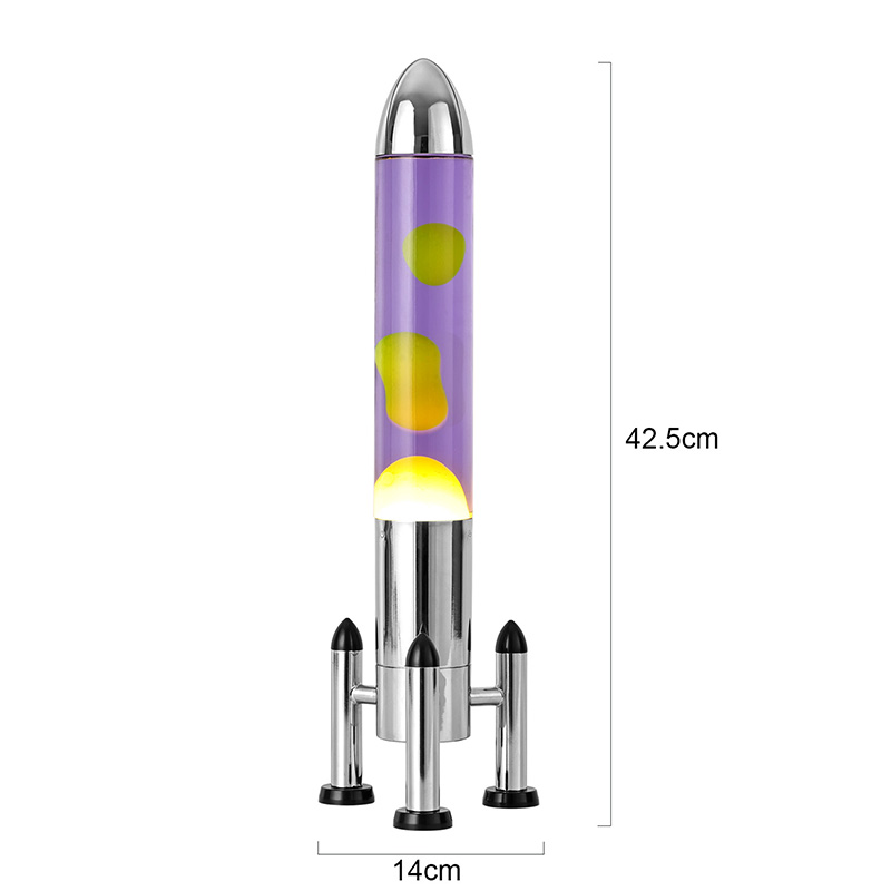 24VĐèn Lava LED cỡ lớn với bóng tên lửa có thiết kế hình tên lửa cổ điển, với vỏ kim loại màu bạc kết hợp với thân chai thủy tinh trong suốt, đơn giản nhưng đầy phong cách. Màu vàng nổi trong chất lỏng màu tím bên trong