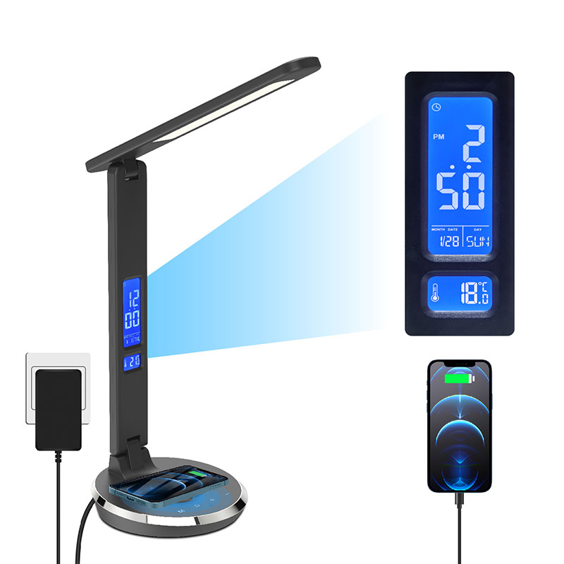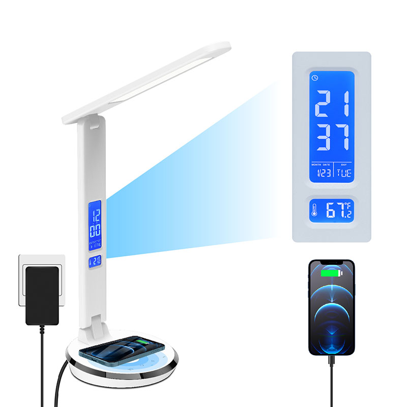 Có màn hình LCD hiển thị Nhiệt độ, Thời gian, Đồng hồ báo thức, Lịch vạn niên với nút điều khiển thân sau. Và có cổng sạc usb phía sau bóng đèn bàn.