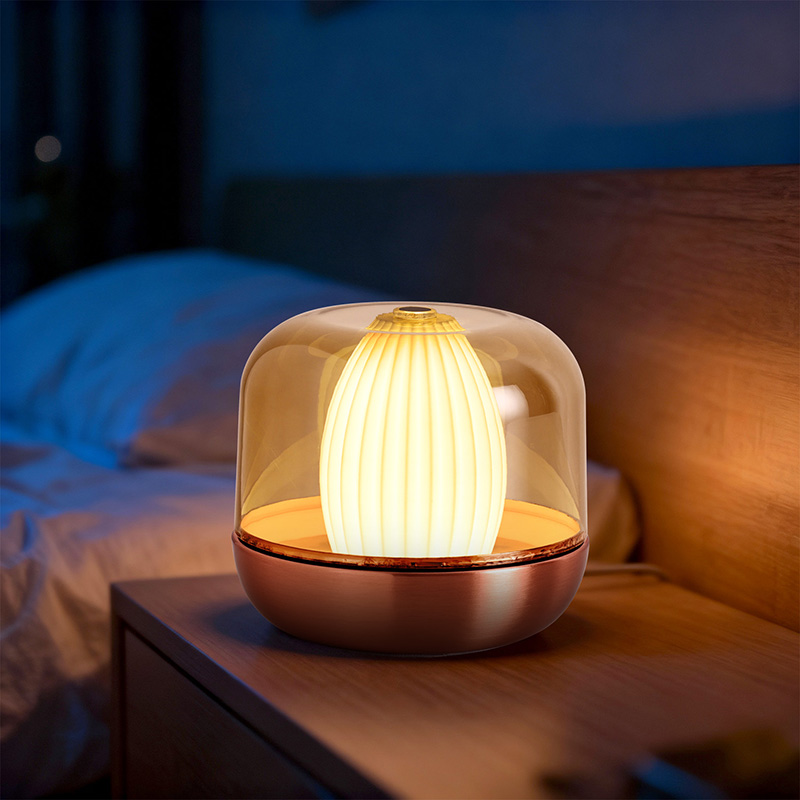 Cảm hứng thiết kế của chiếc đèn ngủ phát sáng ấm áp này bắt nguồn từ sự kết hợp giữa thiên nhiên và thẩm mỹ kiến trúc. Với hình dạng tổng thể tròn trịa và đầy đặn, nó giống như một viên đá quý màu hổ phách được chạm khắc tỉ mỉ. Được đặt trên bàn làm việc, nó dễ dàng trở thành tâm điểm thị giác. Lớp bên ngoài có lớp phủ có độ trong suốt cao, không chỉ bảo vệ nguồn sáng bên trong mà còn tạo ra các lớp ánh sáng và bóng tối độc đáo thông qua khúc xạ, tạo ra hiệu ứng hình ảnh đẹp như mơ.