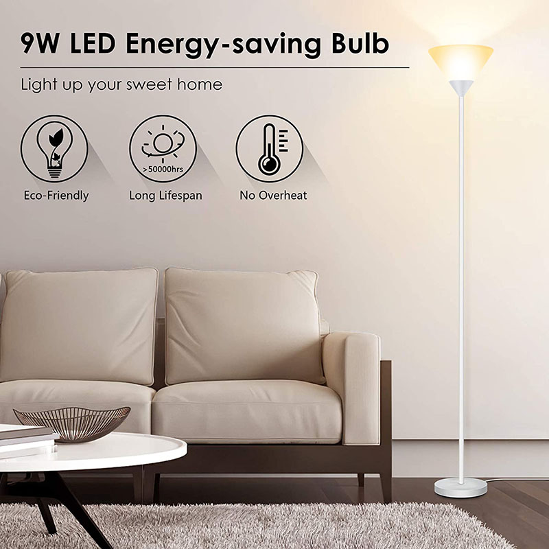 vỏ đèn sàn có bóng LED tiết kiệm điện 9W. Bóng đèn của sản phẩm chiếu sáng hướng lên trên tránh chói mắt và bảo vệ mắt bạn.
